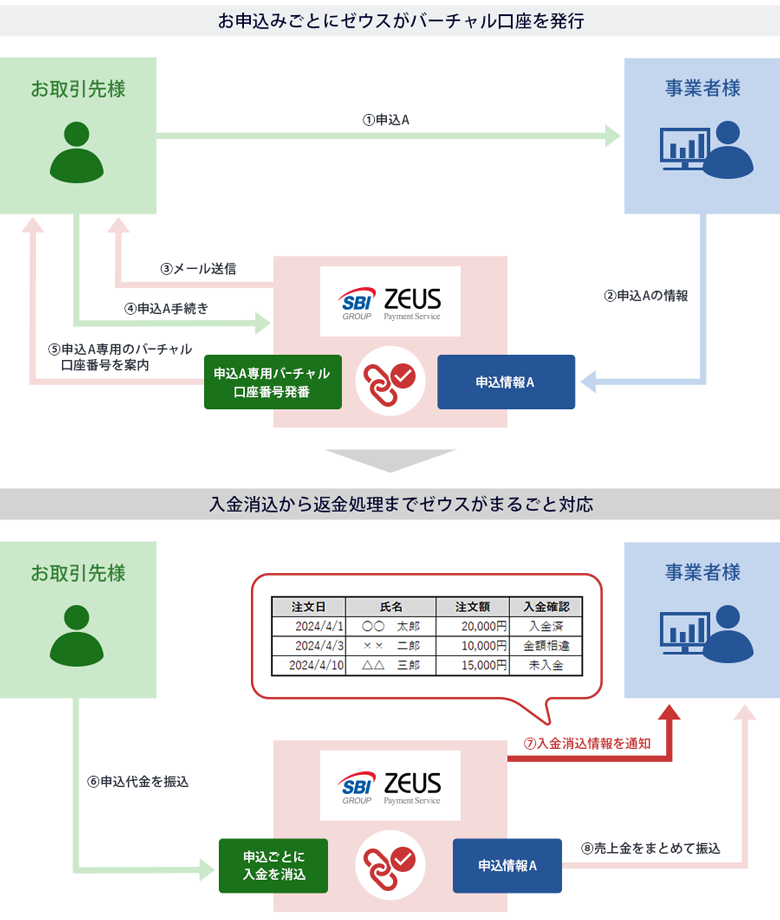 請求情報を登録すると、決済代行会社が請求ごとに紐づけられた専用の振込口座番号をお取引先様に発番し、その後の入金確認と入金消込は決済代行会社が引き受けてくれる仕組みです。